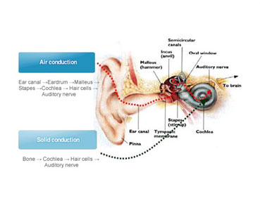 고막에 직접 소리를 전달하지 않고 뼈를 매질로 하여 소리를 전달하는 골전도 방식을 적용하여 만들어진 난청 보조기로써 기존 제품과 달리 코일은 사용하지 않고, 압전체를 사용하여 두통, 어지럼증의 부작용이 없고 뛰어난 음질을 가지고 있는 제품입니다.