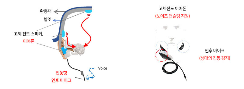 | 고체전도 이어폰 제품은 주변 소음을 차단하고, 상대방의 말소리를 명확하게 들을 수 있음 |